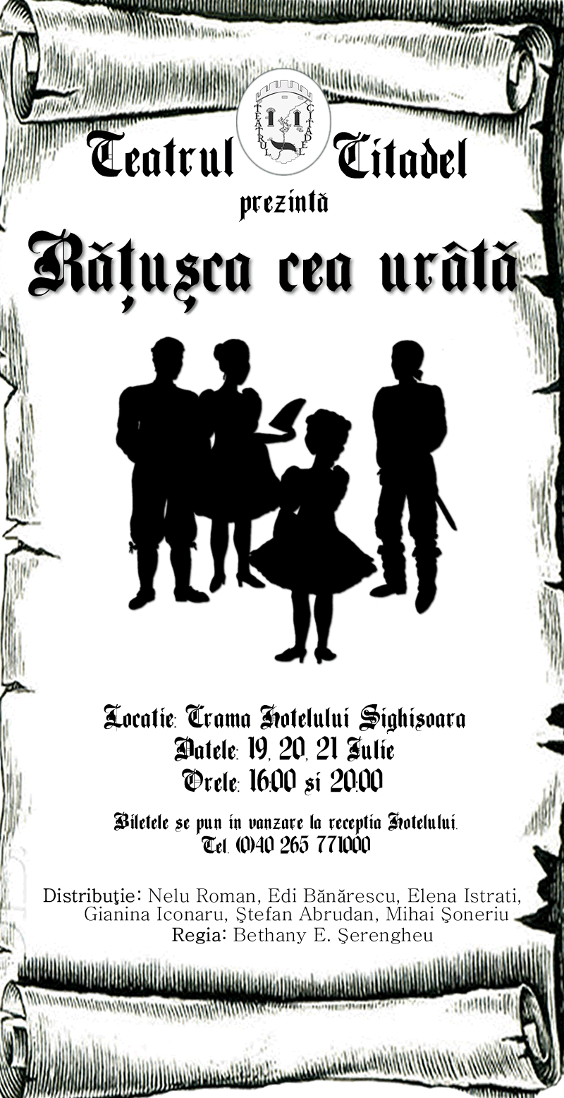 Teatrul Citadela va debuta Joi 19 Iulie, la ora 16:00 cu piesa "Ratusca cea urata", la crama hotelului Sighisoara. In urmatoarele zile, 20 si 21 Iulie, vor sustine zilnic la orele 16 si 20 piesa "Ratusca cea urata".