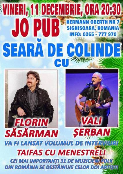 Jo Pub va invita in data de 11 Decembrie 2015 incepand cu ora 22 la seara de Colinde cu Vali Serban si Florin Sasarman. Va fi lansat volumul de interviuri " Taifas cu Menestreli" cei mai importanti 31 de muzicieni folk din Romania se destainuie celor 2 artisti