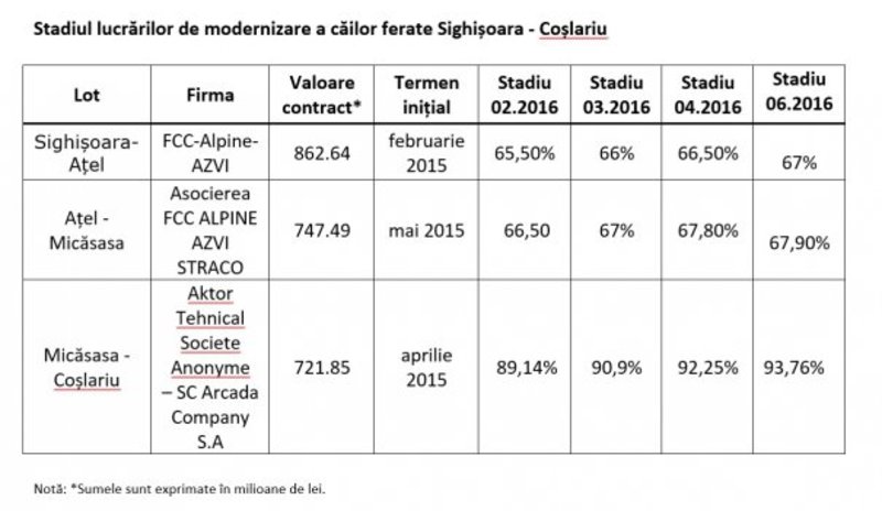 În februarie, aprilie și mai 2012, autoritățile centrale semnau trei contracte de execuție de lucrări pentru modernizarea a trei tronsoane de cale ferată cuprinse între Sighișoara și Ațel, Ațel și Micăsasa și, respectiv, Micăsasa și Coșlariu. Cele trei loturi aflate pe teritoriul administrativ al județelor Mureș, Sibiu și Alba au o lungime totală de 99 de km și vizează modernizarea infrastructurii de cale ferată astfel încât aceasta să permită circulația garniturilor cu viteze de 160 de km/h.