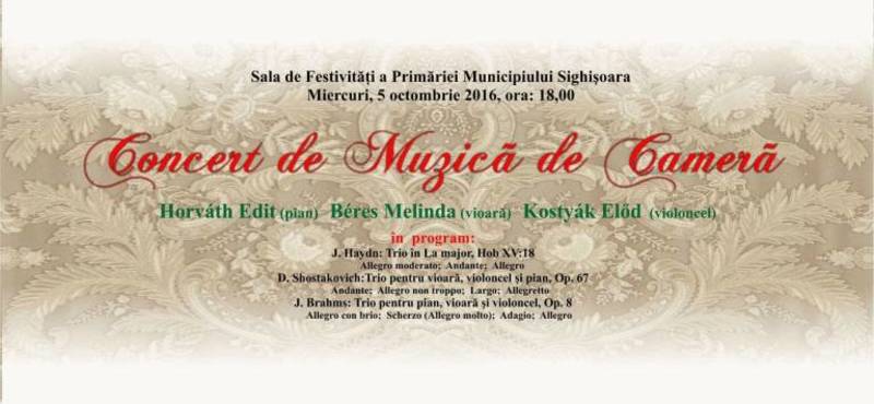 Horvath Edit, Beres Melina si Kostyal Elod va invita la Concert de muzica de camera la sala de Festiviati a Primariei Municipiului Sighisoara. Miercuri, 5 octombrie 2016, incepand cu ora 18.