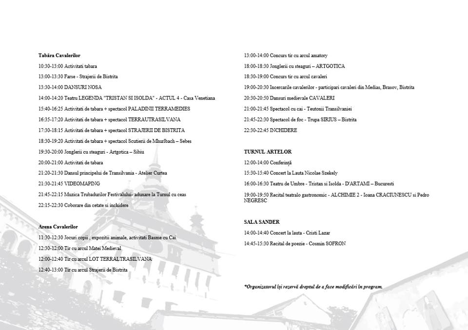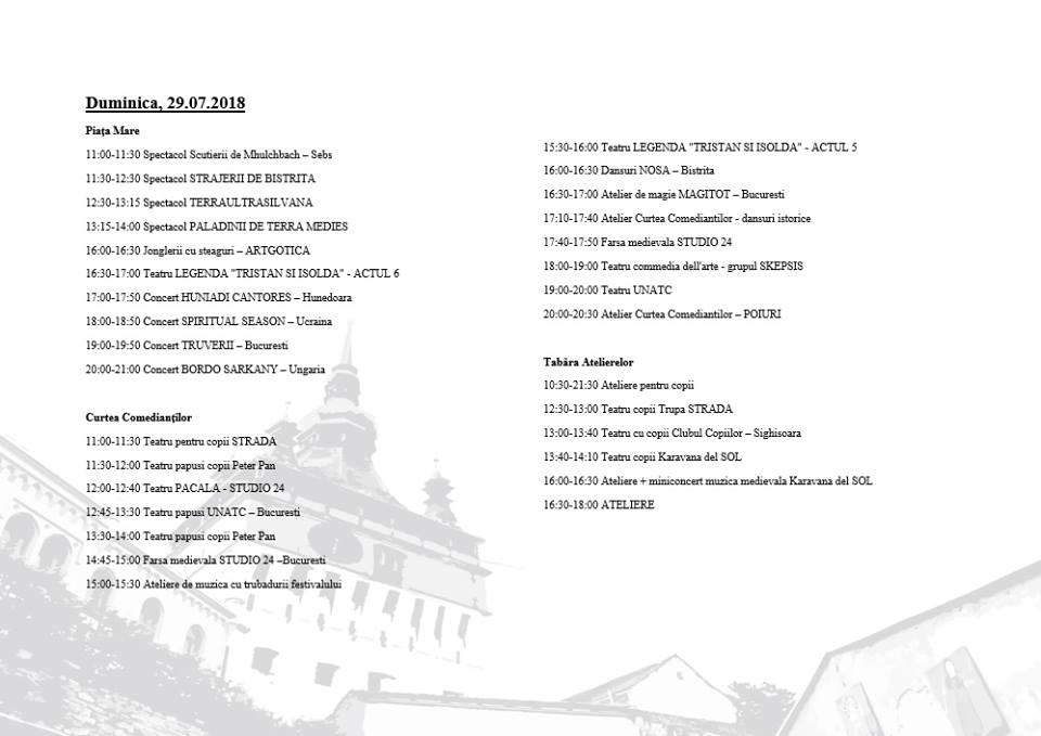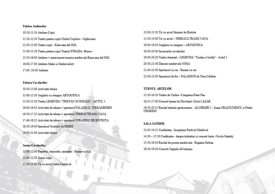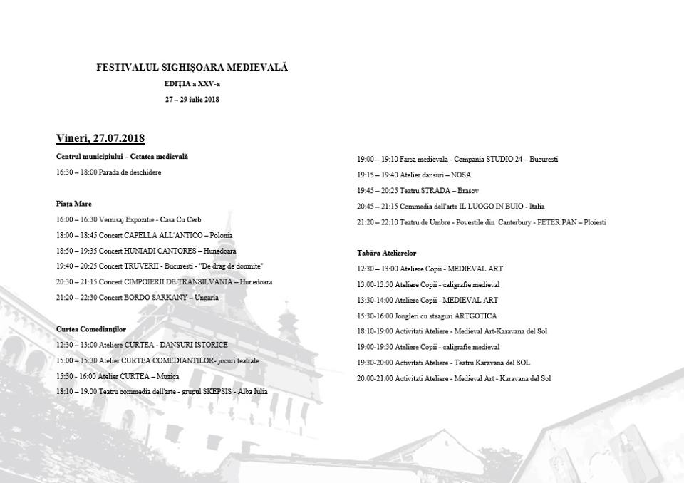 Ediția aniversară a Festivalului Sighişoara Medievală bate la ușa cetății! Având tema ”LEGENDE MEDIEVALE”, cea de-a XXV-a ediție își propune să aducă Festivalul Sighişoara Medievală la valoarea pe care o merită, și anume a celui mai vechi festival medieval din România care să se bucure de autenticitatea perioadei declarate prin spectacole, muzică și imagine, devenind astfel o poartă de călătorie în timp care să pună în valoare Cetatea Sighișoarei. Actualizare 20 Iulie 2018 vizitati pagina Program complet Festivalul Sighișoara Medievală 2018 pentru a vizualiza programul in format text